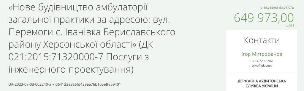 На проєкт будівництва амбулаторії загальної практики у селі Іванівка Бериславського району Херсонської області виділено 649 973 гривень. Про це свідчить відповідна інформація з порталу державних закупівель “Prozorro”. Переможцем тендеру стало рівненське ТОВ “Фенікс Груп Проект”, зареєстроване у березні 2018 року. За даними порталу YouControl, основним видом діяльності фірми є роботи пов’язані з архітектурою, проєктувальними та будівельними роботами. Власником та директором фірми є Руслана Дмитрук, яка також володіє ТОВ «Юнівіз». Ця фірма нещодавно стала переможцем тендеру на проєкт будівництва центру безпеки у селищі Калинівське Бериславського району. Нагадаємо, про те, що в Іванівці з’явиться амбулаторія загальної практики стало відомо 31 липня 2023 року з розпорядження начальника Херсонської ОВА Олександра Прокудіна. Зазначимо, що будівництво амбулаторії відбуватиметься за рахунок субвенції з державного бюджету. Мост