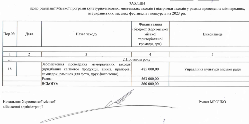 На проведення меморіальних заходів у Херсоні Мрочко виділив майже пів мільйона додаткових коштів