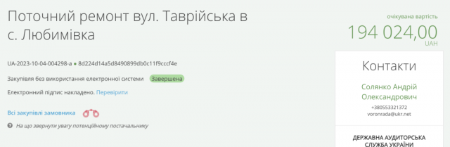 На ремонт дороги у селі Любимівка Нововоронцовської громади Херсонщини виділено 194 024 тисячі гривень.Про це свідчить відповідний догорів, розміщений на порталі державних закупівель “Prozorro”.