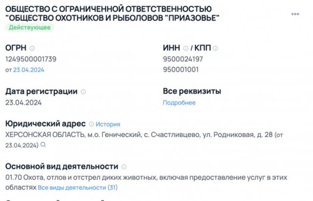 Підприємство зареєстрували із діяльністю у сферах полювання, вилову диких тварин та рибальства. Статутний капіталом вказаний у реєстрі складає 10 мільйонів рублів. При цьому, чомусь прихована інформація про засновників та керівника компанії. Юридична адреса вказує на будинок у селі Щасливцеве, за адресою вул. Джерельна 28.