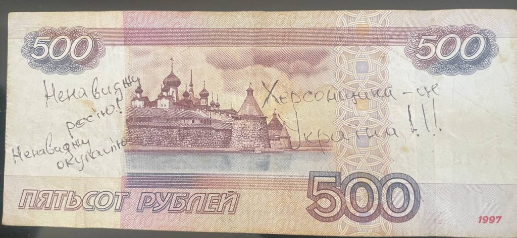 На російських банкнотах номіналом в 100 та 500 рублів, активісти написали “Геть окупантів” та “Скадовськ — це Україна”, “Ненавиджу росію. Ненавиджу окупантів”, “Ми продовжуємо боротися за Україну”,
