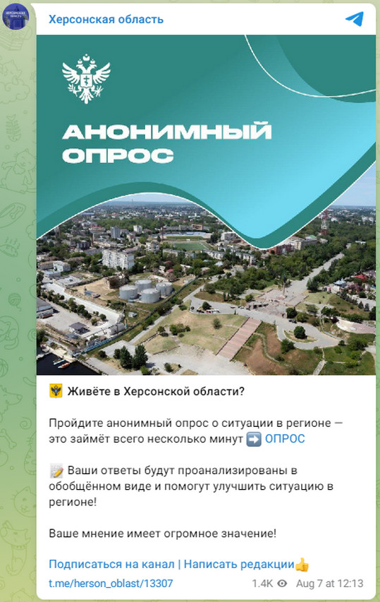 Посилання на опитування опублікували в одному з проросійських Telegram-каналів ТОТ Херсонщини.
