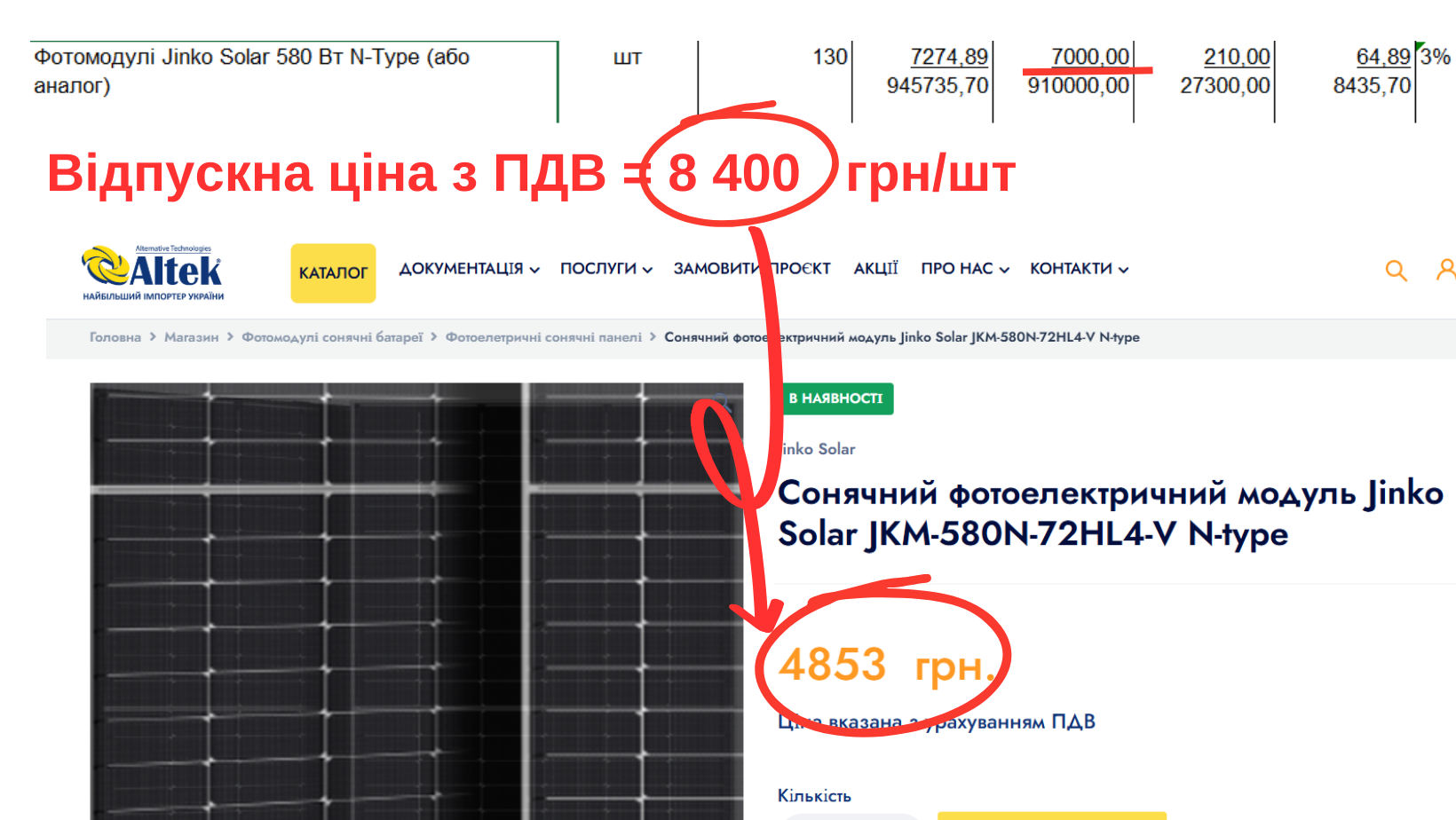 Крім того, 130 фотомодулів Jinko Solar 580 Вт N-Type замовили по 8 400 грн. Однак компанія «Altek» продає їх по 4 853 грн, «Solar market» – по 4 600 грн, а «Правильне електроживлення» – по 4 578 грн. Тобто на 42-46% дешевше від кошторисної ціни.Бетон В30 М400 заклали у кошторис по 4 902 грн/куб. м. Столична група «Ковальська» пропонує різновиди бетону В30 по 3 789-4 209 грн/куб. м залежно від призначення і марки за водонепроникністю та водостійкістю, що на 14-20% дешевше. «RGM Group» продає такий бетон по 4 152 грн/куб. м, а магазин «pl2t» – по цінах від 2 870 до 3 720 грн/куб. м.