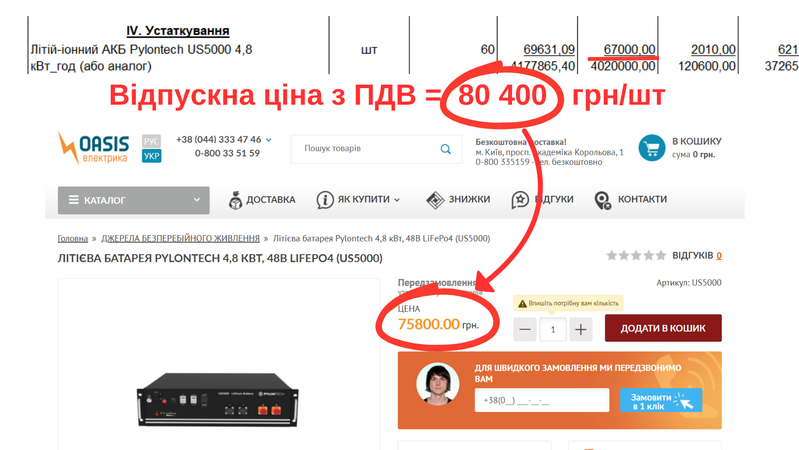 У підсумковій відомості ресурсів найбільша сума 4,82 млн грн іде на 60 акумуляторних батарей Pylontech US5000 4,8 кВт по 80 400 грн (тут і далі ціни та суми вказано з ПДВ).