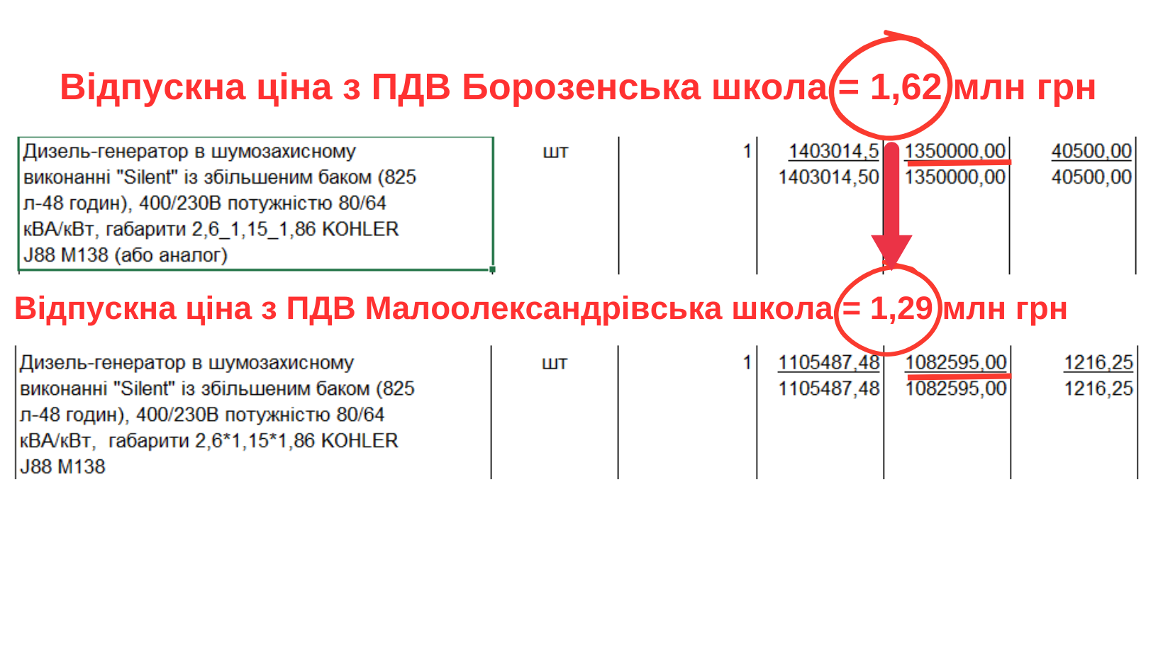 Дизельний генератор Kohler J88 М138 врахували за 1,62 млн грн. У вересневому контракті щодо укриття Малоолександрівської школи на Херсонщині такий коштував 1,29 млн грн, що на 20% дешевше.