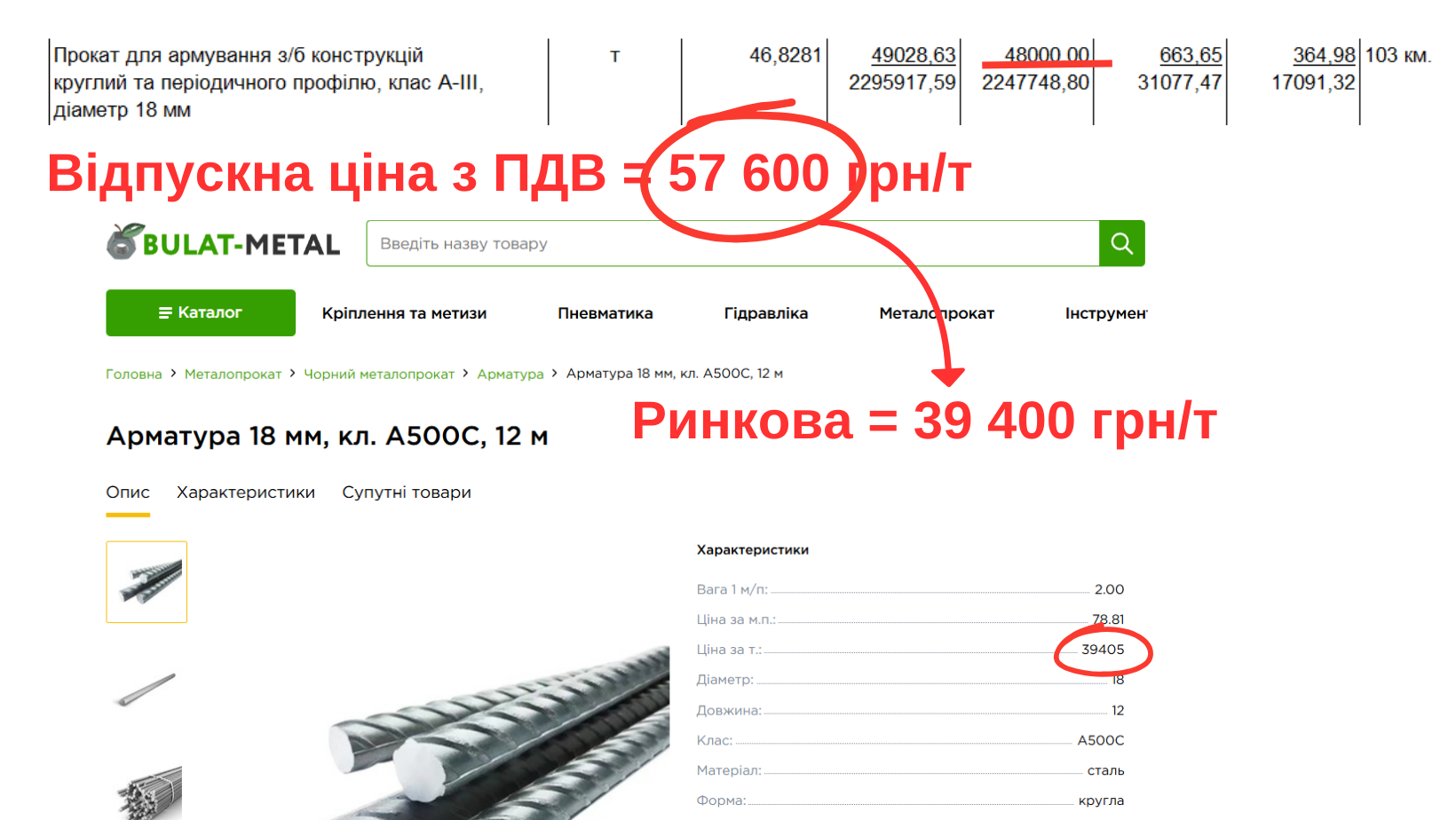 Гарячекатана арматура періодичного профілю класу А-ІІІ різних діаметрів на 20-30% дорожча від ринку. Наприклад, діаметр 18 мм врахували по 57 600 грн/т. Компанія «Булат-Метал» продає його по 39 405 грн/т, а «Метінвест-СМЦ» у Миколаєві – по 34 425 грн/т.Акрил-уретанову захисну фарбу Ceresit CD 53 врахували по 3 000 грн/кг. «Файна Флор» продає її по 1 770 грн/кг, а «Мегатрейд СМ» – по 1 736 грн/кг. Тобто на 41% дешевше.