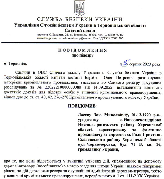 Лосєвій інкримінували пособництво державі-агресору. Вона пішла на співпрацю з росіянами у травні 2022 року.