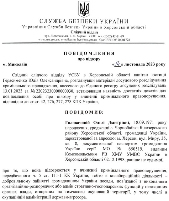 Головачовій інкримінували колабораціонізм. Вона пішла на співпрацю з росіянами не пізніше 1 липня 2022 року.