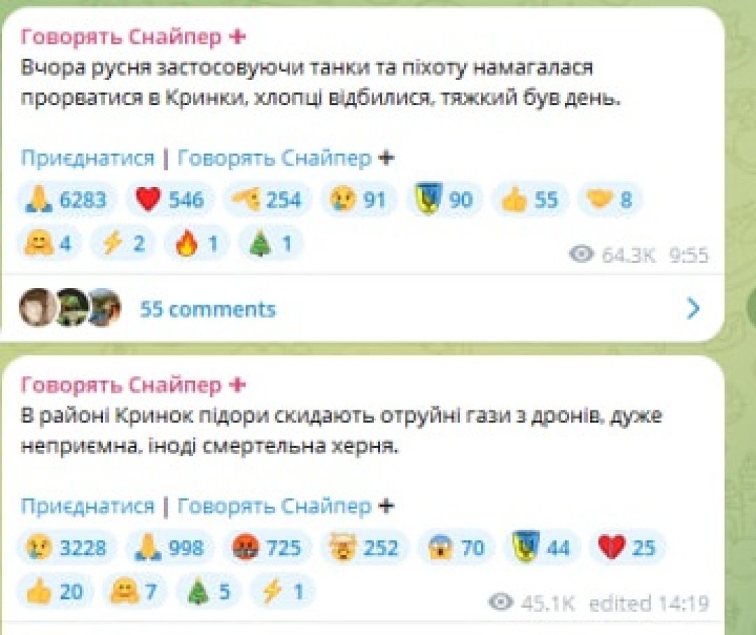 "В районі Кринок окупанти скидають отруйні гази з дронів, дуже неприємна, іноді смертельна х*рня", — проінформував він.