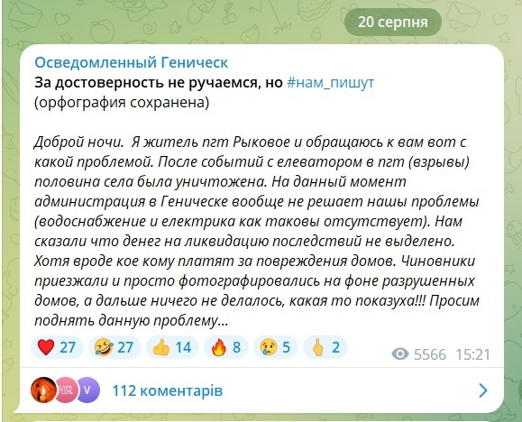 «Я, житель селища Рикове, звертаюся до вас ось із якою проблемою. Після подій з елеватором у селищі (вибухи) половину села було знищено. Зараз адміністрація в Генічеську взагалі не вирішує наших проблем (водопостачання та електрика як такі відсутні). Нам сказали, що грошей на ліквідацію наслідків не виділено. Хоча начебто комусь платять за пошкодження будинків. Чиновники приїжджали і просто фотографувалися на тлі зруйнованих будинків, а далі нічого не робилося, якась показуха! Просимо підняти цю проблему...» – йдеться в повідомленні, розміщеному на одному з Telegram-каналів.