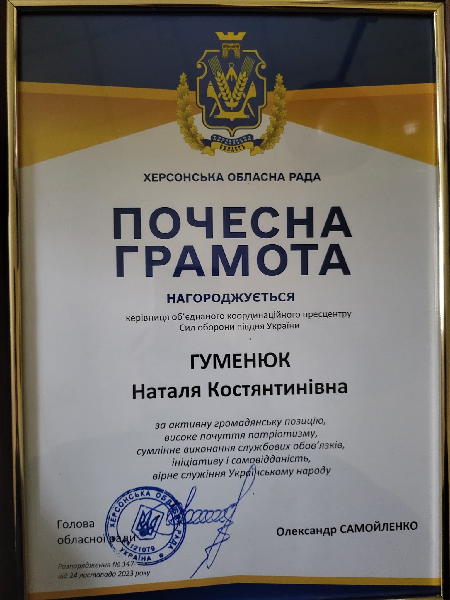 Наталя Гуменюк відзначена Почесною грамотою Херсонської обласної ради
