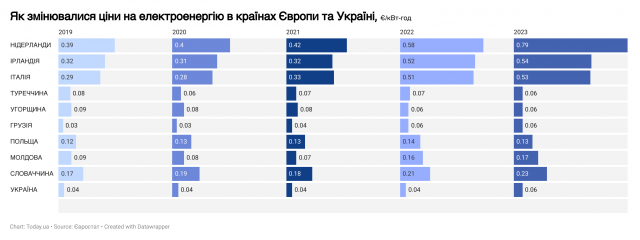 Ми використали дані по Європі станом на 1 півріччя 2023 року (це найсвіжіші дані Євростату), а для України взяли ціну, встановлену з 1 червня 2023 – саме тоді тариф на електрику було підвищено нашим урядом з 1,68 до 2,64 грн/кВт-год. Але навіть попри це Україна – вгорі списку країн із найдешевшою електроенергією.