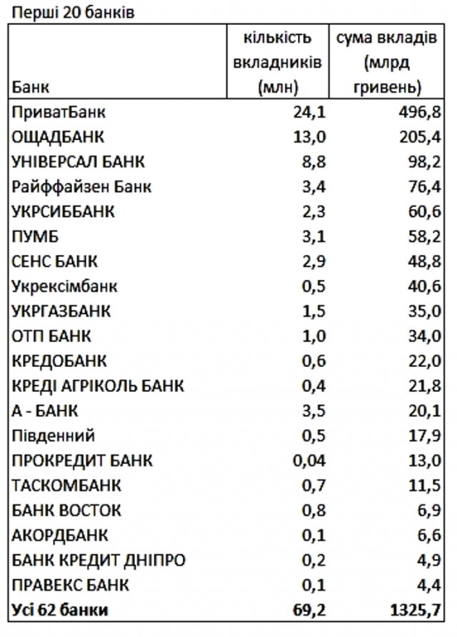 У списку також банки іноземних банківських груп: Райффайзен Банк з 3,4 мільйона вкладників на 76,4 млрд грн, а також Укрсиббанк 2,3 мільйона вкладників, які зберігають там 60,6 млрд грн.