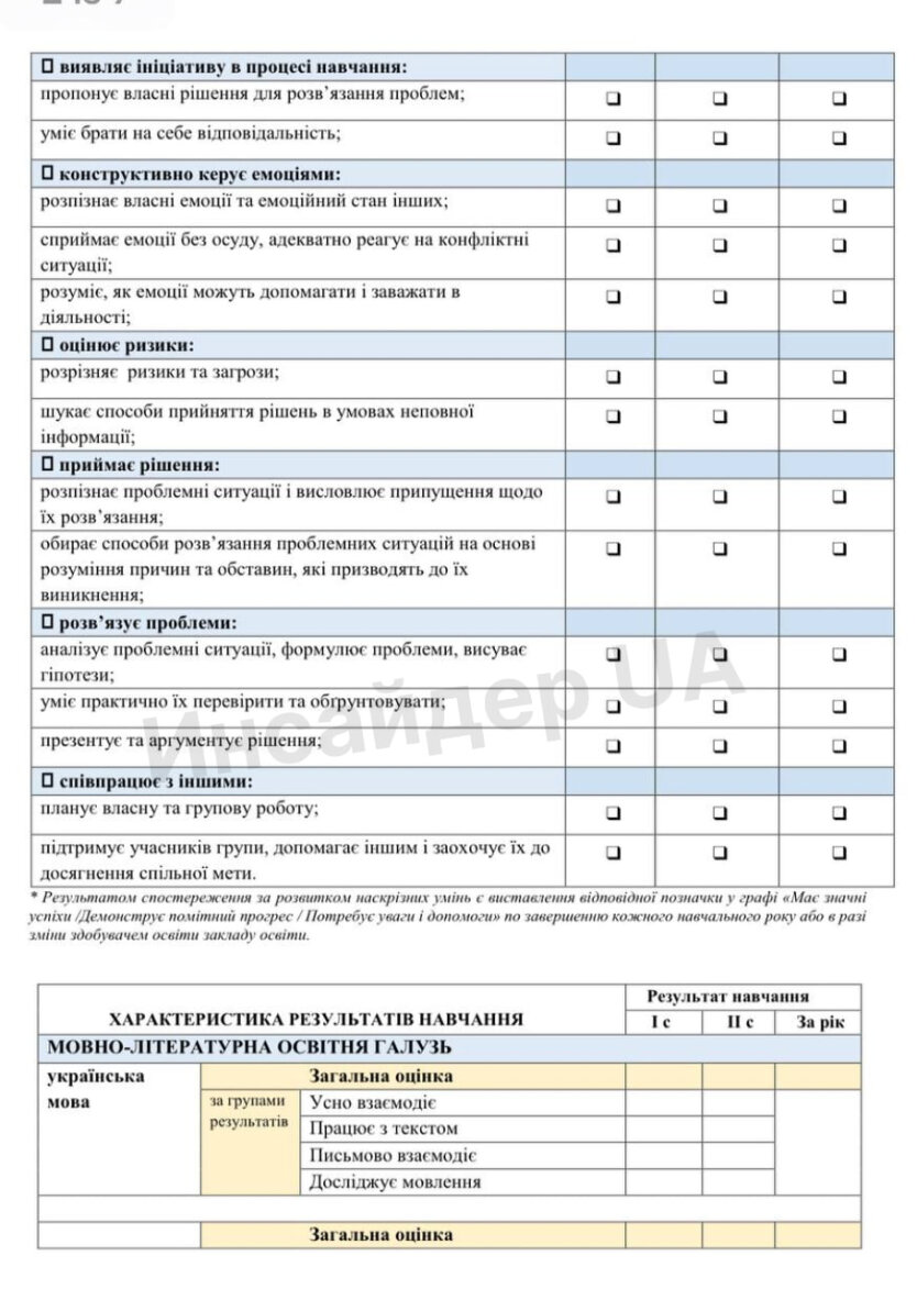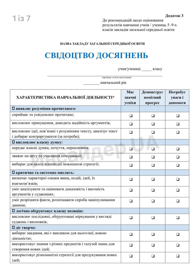 Ключовою новацією є використання Свідоцтва досягнень, що складається з двох частин. Перша частина – "Характеристика навчальної діяльності" – оцінює вміння учня, такі як критичне мислення, ініціативність без використання балів. Друга частина – "Характеристика результатів навчання" – містить бальні оцінки за предмети та інтегровані курси.