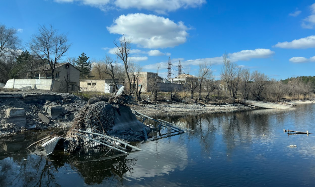 Зруйнований окупантами мостоперехід у Новокаїрській балці, позаду видніється місце, де тримали Олега Яхнієнка. Фото: Олег Батурін / ЦЖР