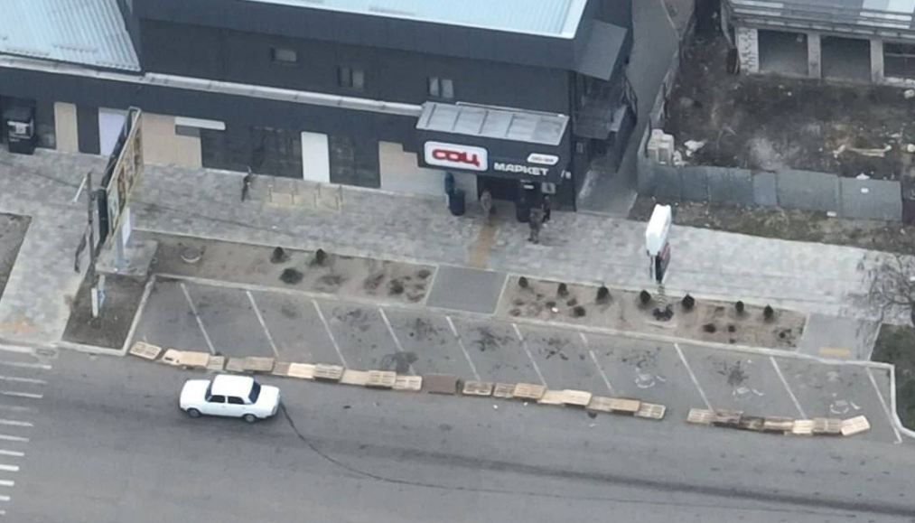 Тепер стоянка біля "Соцмаркету" в районі автовокзалу теж заблокована палетами. Люди змушені ставити машини на дорозі поруч з палетами або на іншому боці дороги. Окупанти також так роблять. На стоянці ближче до перехрестя видно маленьку вирву від вибуху боєприпасу.