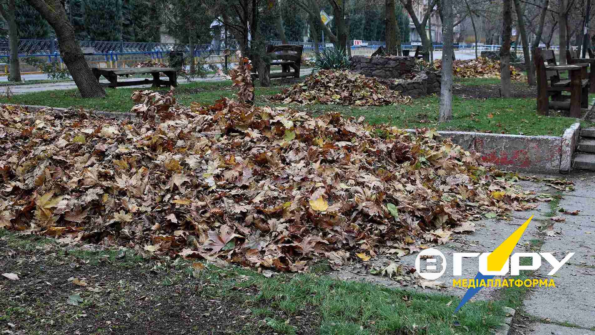 Листя зібране прибиральниками біля парку. Скрин відео Олександра Андрющенка/Вгору