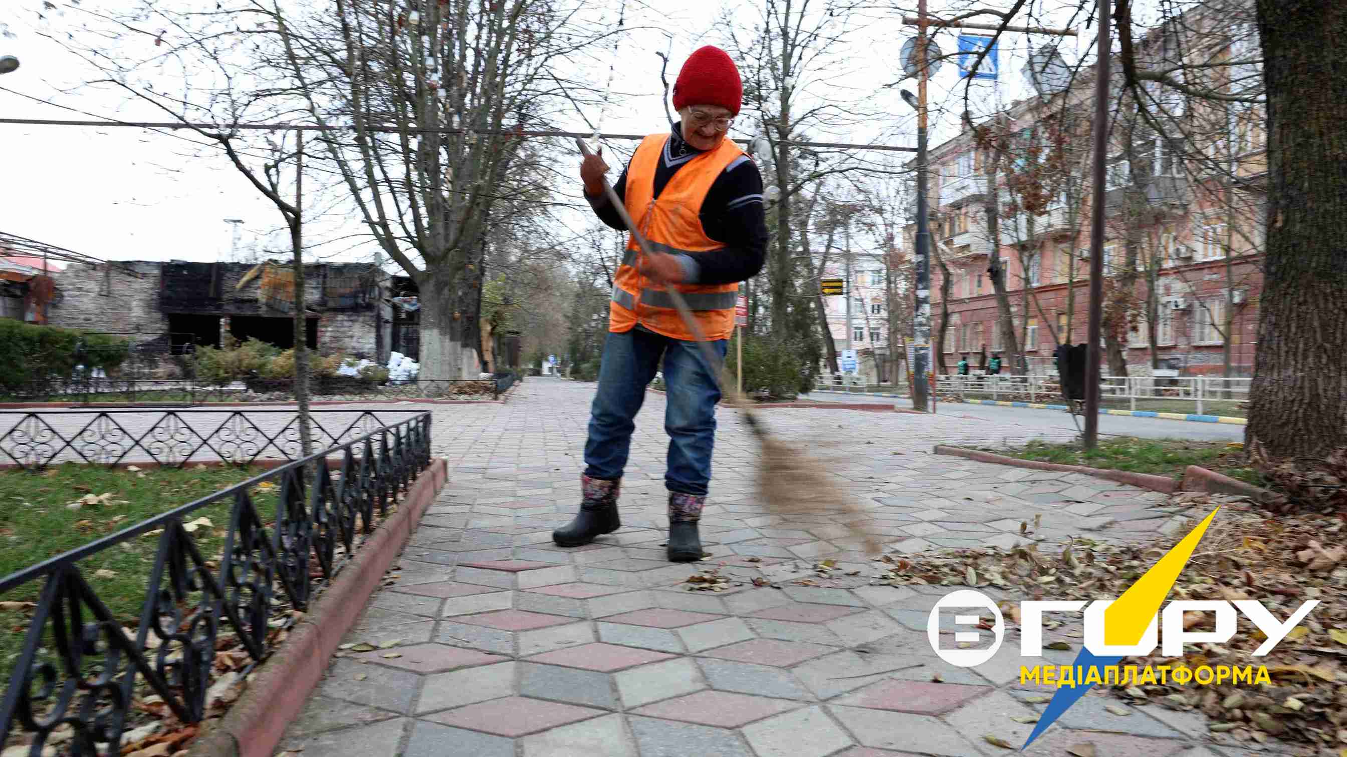Комунальники прибирають опале листя біля парку. Скрин відео Олександра Андрющенка/ Вгору