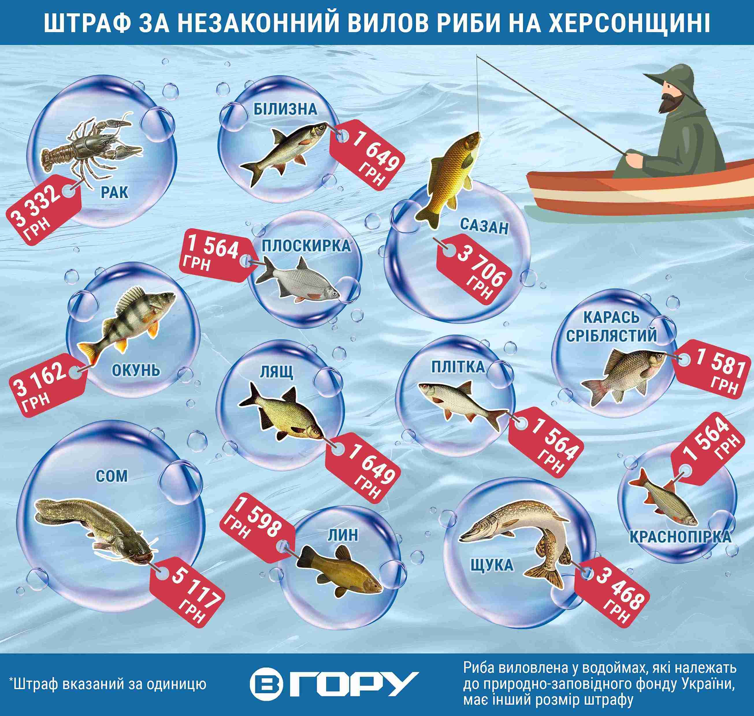 У період нересту вилов риби та раків в місцях, де вони розмножуються, заборонено. Докладний перелік нерестовищ можна побачити у додатку до наказу Управління Державного агентства меліорації та рибного господарства у Херсонській області від «28» березня 2025 р. Загальна площа нерестовищ 16327,3.Нагадуємо, скільки доведеться сплатити порушникам за незаконний вилов риби у гривнях за один екземпляр. Такси чинні й зараз.