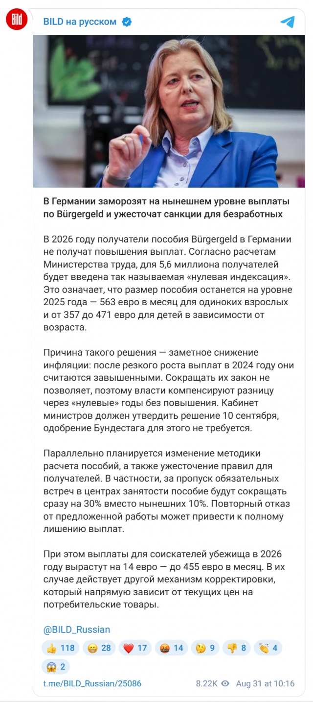 Міністерство праці Німеччини обґрунтовує введення так званої «нульової індексації» суттєвим уповільненням інфляційних процесів у країні. Після значного збільшення соціальних виплат у 2024 році поточний розмір допомоги визнано надлишковим щодо реальної купівельної спроможності.