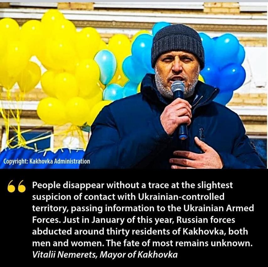 «Арешти та терор тривають. Люди безслідно зникають за найменшої підозри на контакт з підконтрольною Україні територією, передачу інформації ЗСУ чи здійснення пожертв на потребу армії. Докладаються зусилля для евакуації людей на підконтрольні Україні території та у країни Євросоюзу. Нам вдалося евакуювати кілька багатодітних сімей та осіб, що потрапили під приціл окупаційної влади», – говорить Віталій Немерець (мер сусідньої Каховки) в одному з останніх інтерв’ю європейським журналістам.