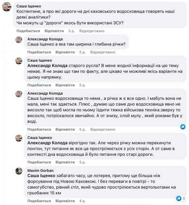 У військових блогах розгорілись жваві дискусії щодо того, чому вогневий контроль цієї місцевості – критично важливий, і чи може будь-яка зі сторін використати ці старі дороги на дні Каховського водосховища для проведення десантних операцій. Зокрема, з цього приводу в ефірі 24 каналу висловився військовий експерт, льотчик-інструктор, полковник запасу ЗСУ Роман Світан.