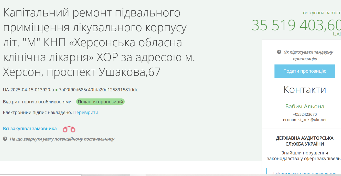 Переможець має завершити ремонт до 25 грудня 2025 року. Замовником є обласна лікарня, яка діє відповідно до розпорядження начальника Херсонської ОВА та за підтримки Міжнародного комітету Червоного Хреста.