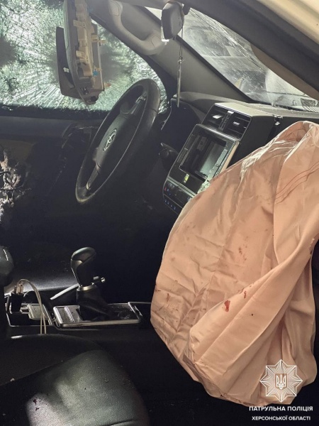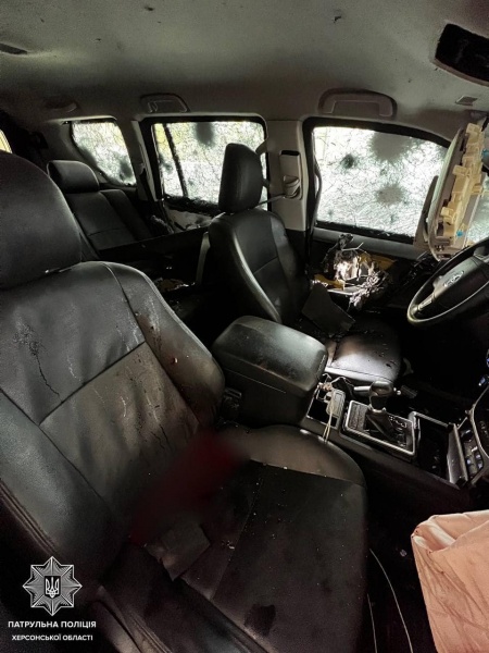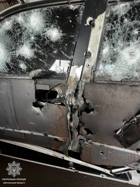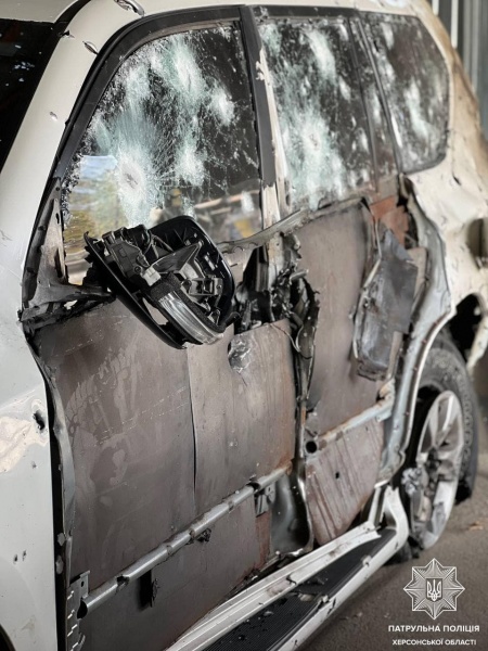 Він також показав фото службового авто херсонських патрульних, які сьогодні потрапили під російський обстріл. За їхні життя наразі борються лікарі.