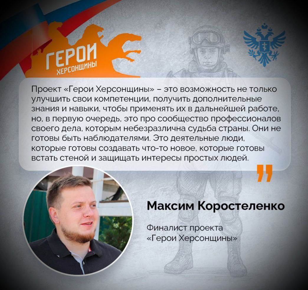 Але не лише Оганєсов вже «все знає». Окупаційний телеканал «Таврия» представив ще одного – Максіма Коростєлєнка: «Колишній працівник адміністрації Краснодару, який залишив кар’єру заради участі у спецоперації, став фіналістом проекту «Герої Херсонщини». Після поранення він вирішив пов’язати своє життя з Херсонською областю».