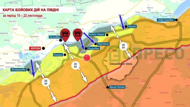20 листопада Сергій Братчук, речник Української добровольчої армії "Південь" розповів, що українські морські піхотинці знищили кілька вантажівок ворога на трасі Олешки - Нова Каховка
