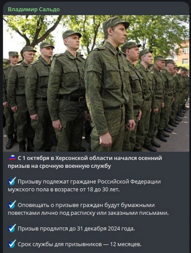 “Молоді люди з Херсонщини вперше закликаються до виконання почесного обов’язку із захисту Батьківщини та проходитимуть термінову службу в частинах на території Південного військового округу. Дорогі друзі, впевнений, що ви гідно представите Херсонську область у Збройних силах Російської Федерації, заслужите повагу товаришів та подяку командирів”, – урочисто привітам майбутнє поповнення окупантів так званий “губернатор” Херсонщини Володимир Сальдо.