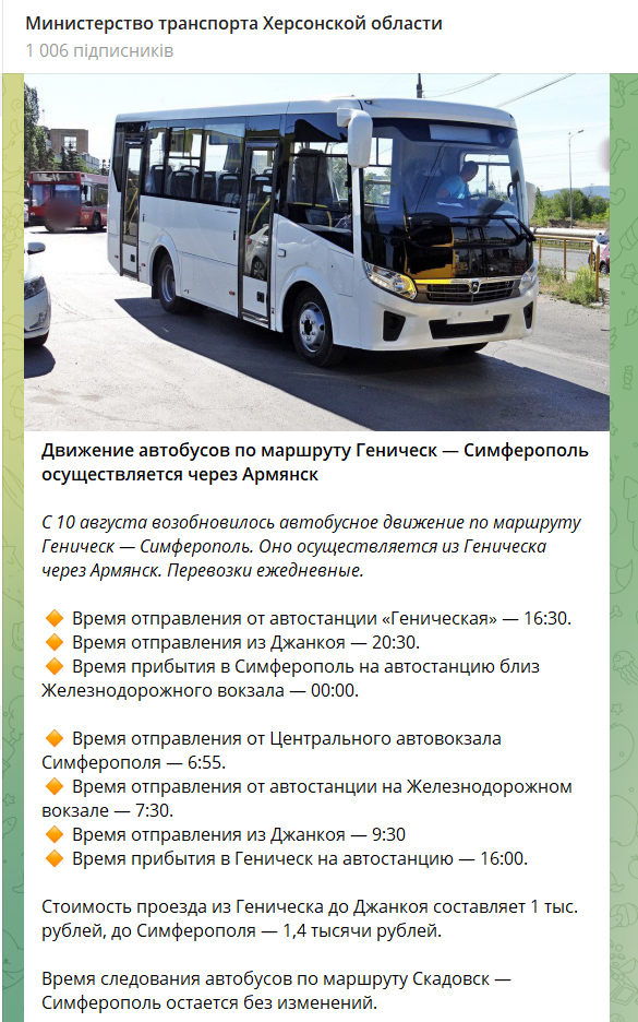 З 10 серпня окупанти відновили автобусний рух маршрутом Генічеськ — Сімферополь. Маршрут проходить з Генічеська через Армянськ. Перевезення щоденні.