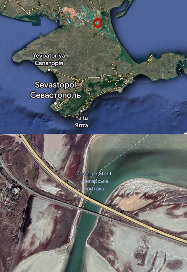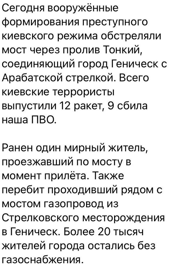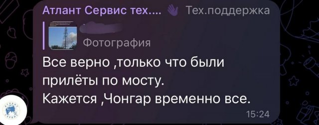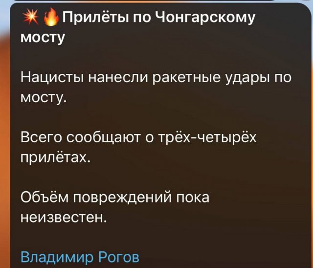 Пізніше гауляйтер Криму сергій аксьонов також підтвердив удари по Чонгарському мосту. За його словами, нібито є одне влучення, а ще кілька ракет збила ППО. "Є пошкодження дорожнього полотна автомобільного мосту, ремонтні роботи вже розпочинаються. Жертв немає", - заявив він.