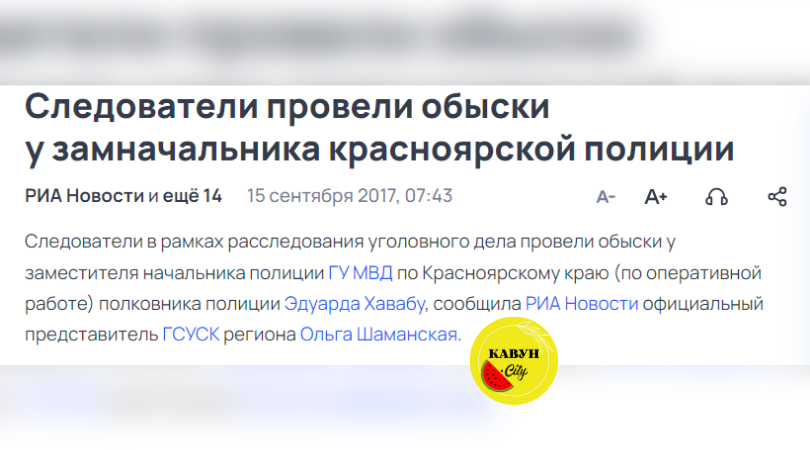 22 березня 2017 року вийшло анонімне розслідування, в якому йшлося про те, що Едуард Хавабу створив та очолив організоване злочинне угруповання, що складається з «правоохоронців» (чинних та колишніх), юристів та представників кримінальних кіл регіону. ОЗУ займалося в Красноярському краю практично усім, що могло принести кошти: проституцією, нелегальним продажем алкоголю, рейдерством, відмиванням коштів, нелегальним ігровим бізнесом, продажем наркотиків тощо.