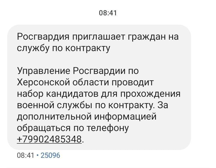 Росіяни розсилають СМС-повідомлення місцевому населенню Херсонської області із закликом приєднатися до Росгвардії та інших силових структур окупантів.Про це повідомляє рух спротиву “Атеш”.