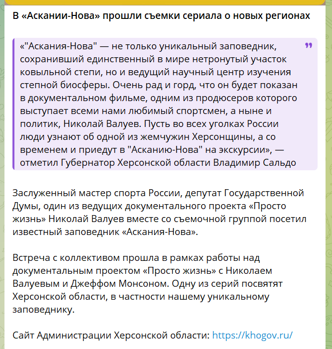 Про це повідомляють терористичні окупаційні джерела. Пропагадист і колишній спортсмен, фігурант санкційних списків цивілізованих країн світу, Ніколай Валуєв приїздив до Асканії-Нова на початку грудня 2022 року і навіть фотографувався із окупантами і тамтешніми зрадниками.