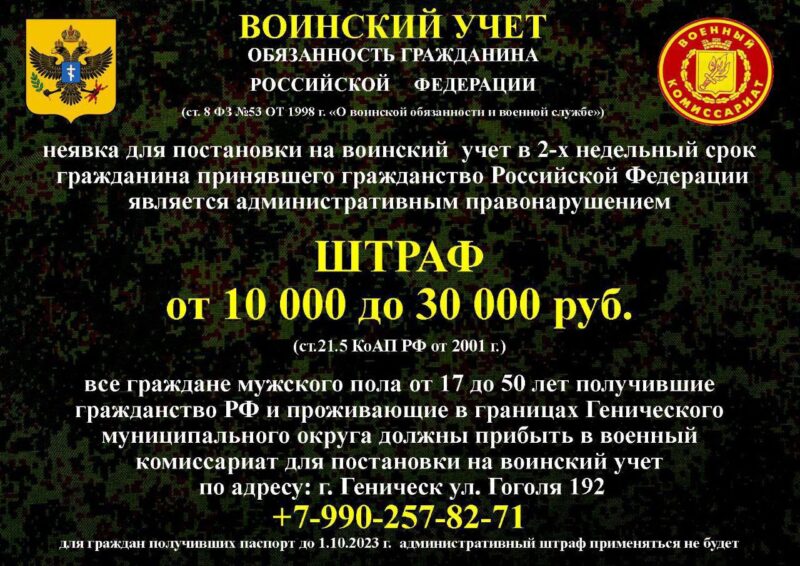 Російські окупанти закликають жителів Генічеського району стати на військовий облік у військкоматі у місті Генічеськ.Про це повідомляє Telegram-канал “Генічеськ UA”.На окупаційних Telegram-каналах з’явилася інформація про те, що в Генічеську запрацював так званий “військкомат Херсонської області” і навіть вказали адресу на Telegram-канал окупаційного “військкомату”.