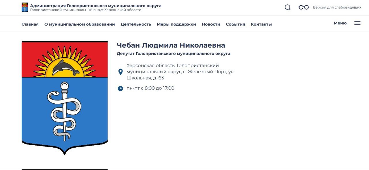 На сайті «Госуслуги» про колаборантку сказано, що працює вона «депутатом» щодня, крім суботи і неділі, з 8.00 до 17.00, у «раді», яка знаходиться у Залізному Порту на вулиці Шкільній, буд. 63.