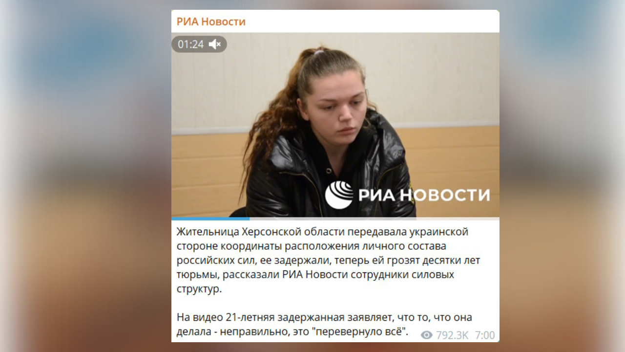 Скрин новини проросійського медіа13 лютого 2024 року окупаційний суд на захопленій частині Херсонської області засудив Аню Єльцову до десяти років позбавлення волі у колонії загального режиму за “шпигунство”.