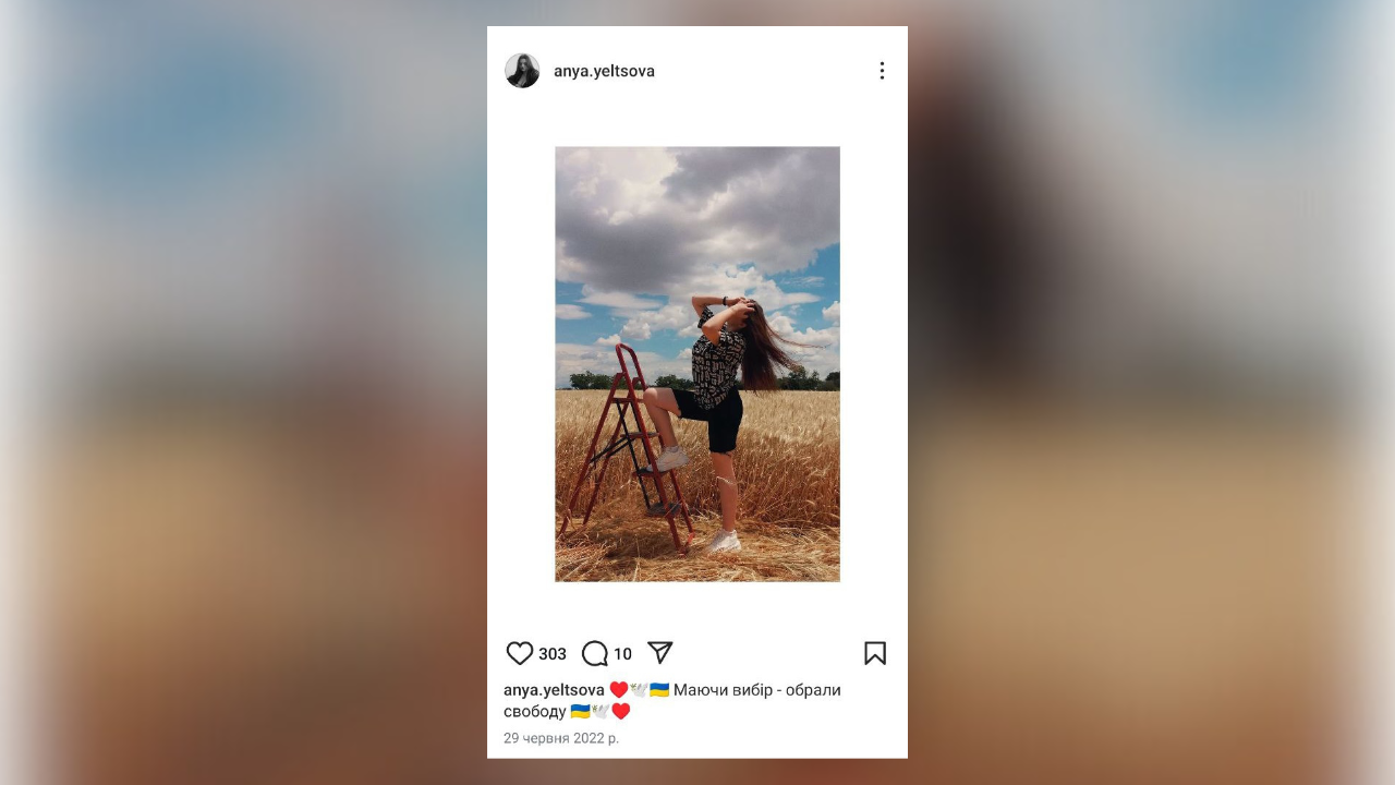 Аня Єльцова активно вела свої соціальні мережі. Цей допис у Instagram дівчина опублікувала ще до того, як українські військові звільнили Херсон від окупаціїНаприкінці листопада дівчина поїхала до бабусі в сусіднє село Агаймани, де за кілька днів по неї прийшли російські силовики. Вони повідомили, що давно стежать за нею. Пізніше рідні дізналися, що на Аню написали донос. Його автором стала місцева жителька Галина Костенко, яка співпрацює з окупаційною владою.