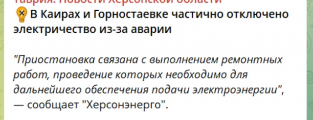 В окупованих росіянами селі Каїри та селищі Горностаївка, що в Каховському районі Херсонщини, знову немає світла.Про це повідомили окупаційні медіа.