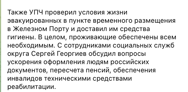 А ось колишній пропагандист Сергій Георгієв на окупованих територіях займається «соціалкою» та незаконною паспортизацією: як доповідає Сальдо, «Сергій Георгієв обговорив питання прискорення оформлення людям російських документів, перерахунку пенсій, забезпечення інвалідів (йдеться про людей з інвалідністю) технічними засобами реабілітації».