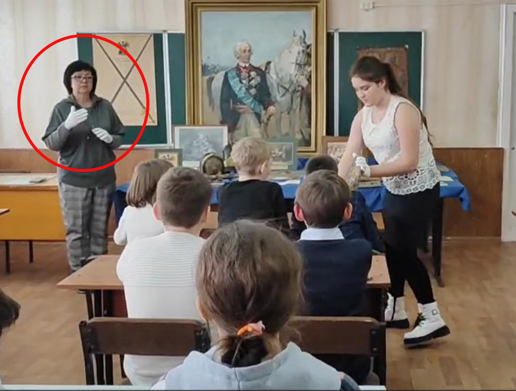 Кадр з пропагандистського ролика, на якому зафіксована Юлія Ржевська, заступниця директорки-колаборантки краєзнавчого музею Тетяни Братченко, яка демонструє школярам в окупованому Генічеську викрадені музейні експонати, пов’язані з Суворовим.