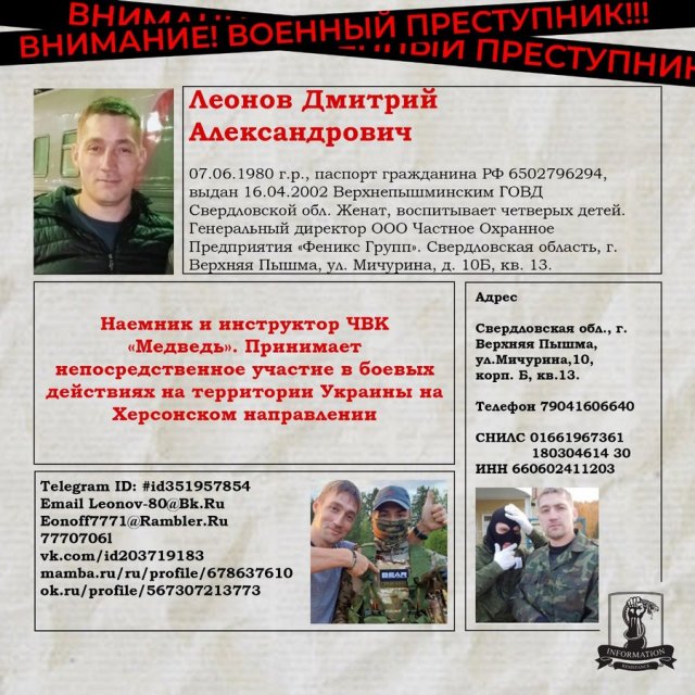 OSINT-секція групи «ІС» представляє чергового воєнного злочинця.Леонов Дмитро Олександрович, 07.06.1980 р.н., паспорт громадянина рф 6502796294, виданий 16.04.2002 Верхньопишмінським ГВВС Свердловської обл. Одружений, виховує чотирьох дітей.