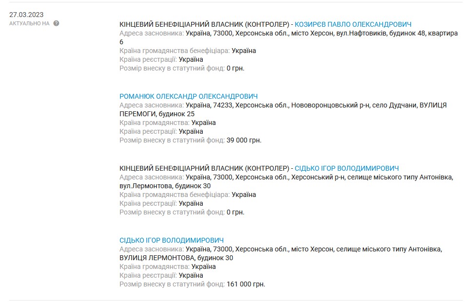 Варто додати, що люди, пов'язані з ТОВ "Д.І.С. Буд", раніше вже фігурували в закупівлях послуг з ремонту укриттів від Відділу цивільного захисту Херсонської міськради. Зокрема, інший співзасновник компанії у лютому цього року отримав договори на ремонт двох бомбосховищ у місті на загальну суму близько 2,3 млн гривень. Мова про Ігоря Сідько, який досі є одним з бенефіціаром "Д.І.С. Буд".