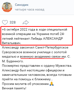 Тим часом у російських пабліках повідомили про смерть 24-річного Алєксандра Лєбідя в Україні, в зоні бойових дій 6 жовтня 2022 року. У себе на батьківщині його вважають героєм і представили до «ордена мужності» посмертно. «Алєксандр був справжнім офіцером і чудовою людиною, завжди готовою прийти на допомогу іншим», – стверджують у російських пабліках.