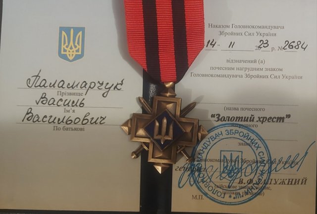 У перші місяці повномасштабного вторгнення Росії Василь брав участь в деокупації Бучі та Ірпіня. Він розповідав: «Ми прикривали групу, яка туди заходила першою. Розвідка ТрО – це не ГУР і не ССО. Ми просилися, щоби нас брали на завдання».У листопаді 2023 року ще за бої у лютому під Бахмутом Василь Паламарчук був нагороджений нагрудним знаком «Золотий Хрест».