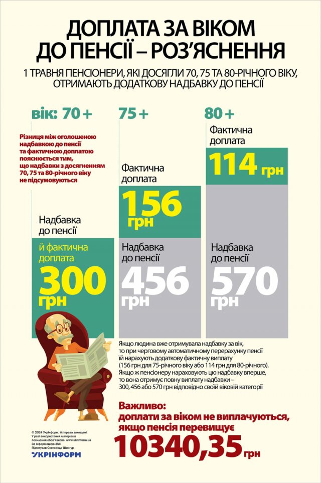 З 70-річного віку українці щомісячно отримуватимуть додатково 300 грн на місяць, з 75-річного – 456 грн (+156 грн), а з 80-річного – 570 грн (+114 грн).