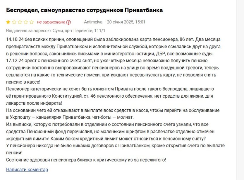 "Пенсіонер категорично не хоче бути клієнтом Привату після такого безладу, який позбавив її гарантованого Конституцією, ст. 46 пенсійного забезпечення, немає коштів для життя, для ліків після інфаркту! На якій підставі їй відмовляють у виплаті всіх коштів у касі, щоб перейти на обслуговування в Укрпошту - канцелярія Приватбанку, чат-боти – мовчать", - наголошується у скарзі.