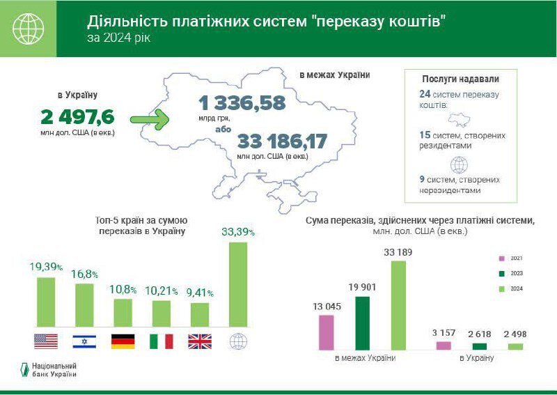 Щодо міжнародних переказів, то в Україну надійшло близько 2,5 млрд доларів США, що на 4,6% менше, ніж у 2023 році. "Найбільші обсяги коштів в Україну надходили зі США, Ізраїлю, Німеччини, Італії та Великої Британії", - зазначається у звіті НБУ. Середня сума одного переказу з-за кордону склала 267 доларів США.